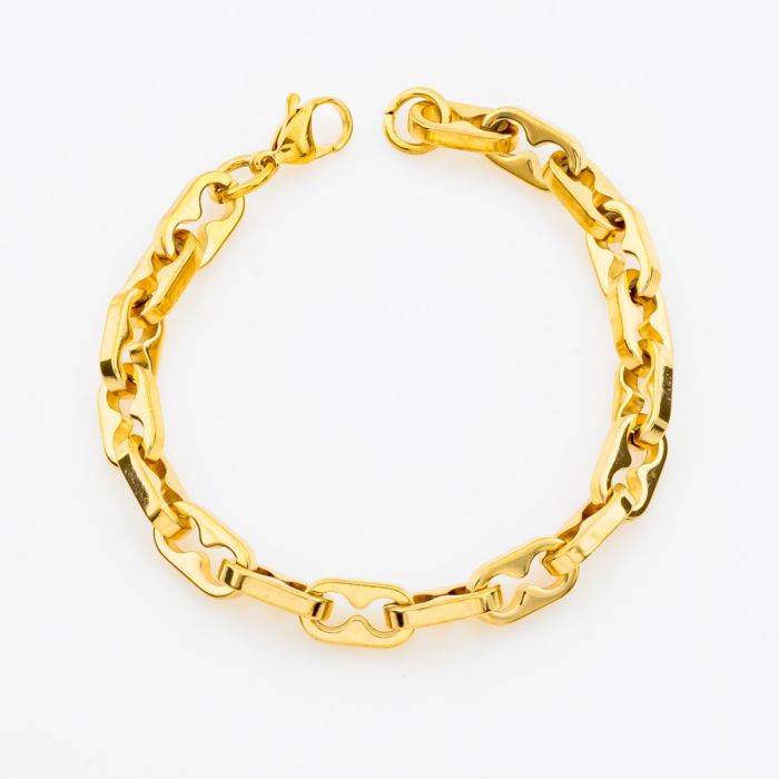 Για τη γυναίκα που δεν φοβάται να εκφραστεί μέσα από το στυλ της, αυτό το χρυσό βραχιόλι είναι κάτι περισσότερο από ένα απλό αξεσουάρ. Είναι ένα έργο τέχνης που αγκαλιάζει τον καρπό, με έναν πρωτότυπο σχεδιασμό κρίκων που μαγνητίζει τα βλέμματα. Κάθε κρίκος αφηγείται μια ιστορία σύγχρονης κομψότητας και εκλεπτυσμένης αισθητικής, προσθέτοντας μια αύρα μοναδικότητας στην κάθε σας εμφάνιση.