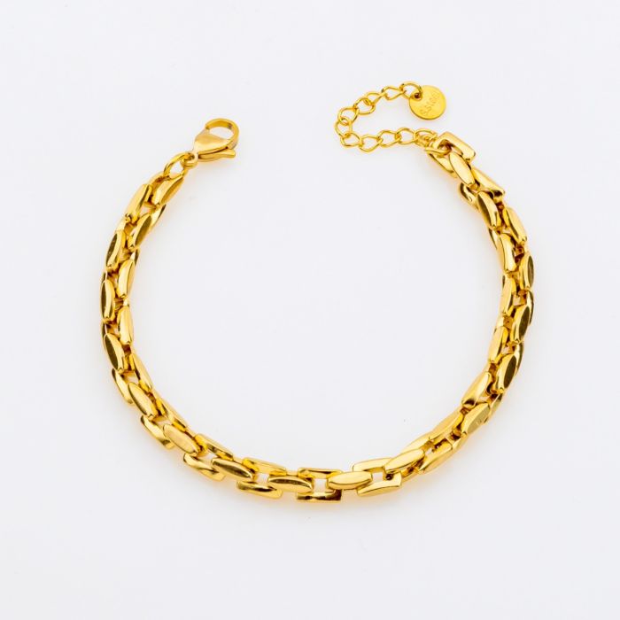 - Μοναδικός Σχεδιασμός Κρίκων: Οι επίπεδοι, οβάλ κρίκοι δημιουργούν ένα ξεχωριστό πλέγμα που προσδίδει βάθος και υφή, κάνοντας το βραχιόλι να ξεχωρίζει από τα συνηθισμένα.