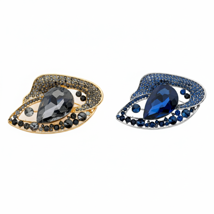 Για τη γυναίκα που αγαπά την κομψότητα και δεν φοβάται να ξεχωρίζει, αυτή η καρφίτσα είναι το απόλυτο κόσμημα. Ο εντυπωσιακός σχεδιασμός της, με το μεγάλο κρύσταλλο σε σχήμα δάκρυ στο κέντρο, αιχμαλωτίζει το φως και τις εντυπώσεις. Περιτριγυρισμένη από αμέτρητα αστραφτερά στρασάκια, προσφέρει μια πολυδιάστατη λάμψη που μεταμορφώνει κάθε εμφάνιση. Επιλέξτε ανάμεσα στον ζεστό χρυσό τόνο με τις μυστηριώδεις γκρι αποχρώσεις ή τον κλασικό ασημί τόνο με το βαθύ, σαγηνευτικό μπλε, για να εκφράσετε την προσωπικότητά σας με έναν τρόπο που εκπέμπει αυτοπεποίθηση και απαράμιλλο στυλ.