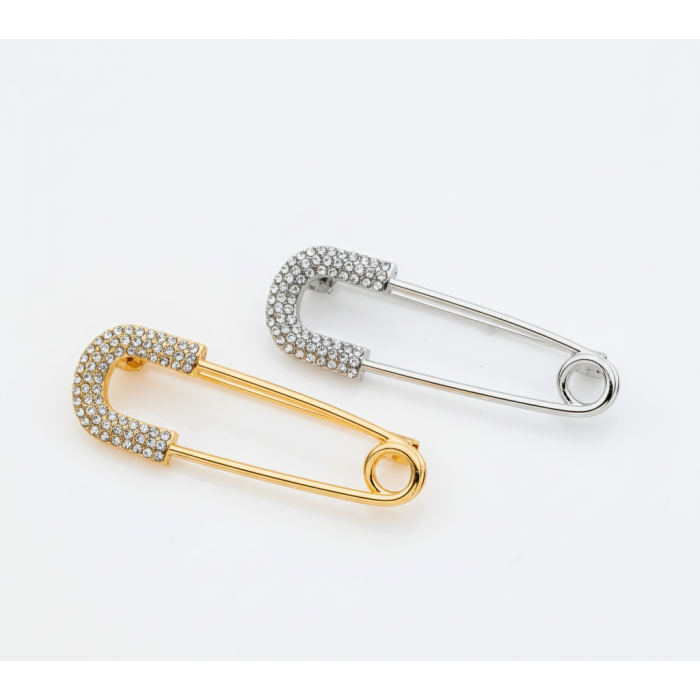 Α: Η καρφίτσα είναι διαθέσιμη σε δύο κομψές αποχρώσεις: λαμπερό χρυσό και κλασικό ασημί, και οι δύο με διαφανή, αστραφτερά στρας.