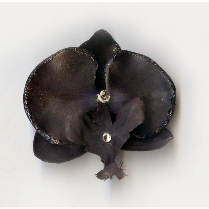 Η βάση του είναι ένα περίτεχνο υφασμάτινο λουλούδι σε βαθύ, πλούσιο μαύρο, που προσφέρει μια απαλή, ποιοτική υφή. Στην καρδιά του, αντί για ένα συνηθισμένο κέντρο, κρύβεται μια μικρή έκπληξη: 2 προσεκτικά τοποθετημένα στρας που αιχμαλωτίζουν το φως και προσθέτουν μια ανεπαίσθητη, αλλά καθοριστική νότα λάμψης. Στηρίζεται σε μια κλασική γαλλική μπαρέτα, εγγύηση για σταθερότητα και αξιοπιστία.