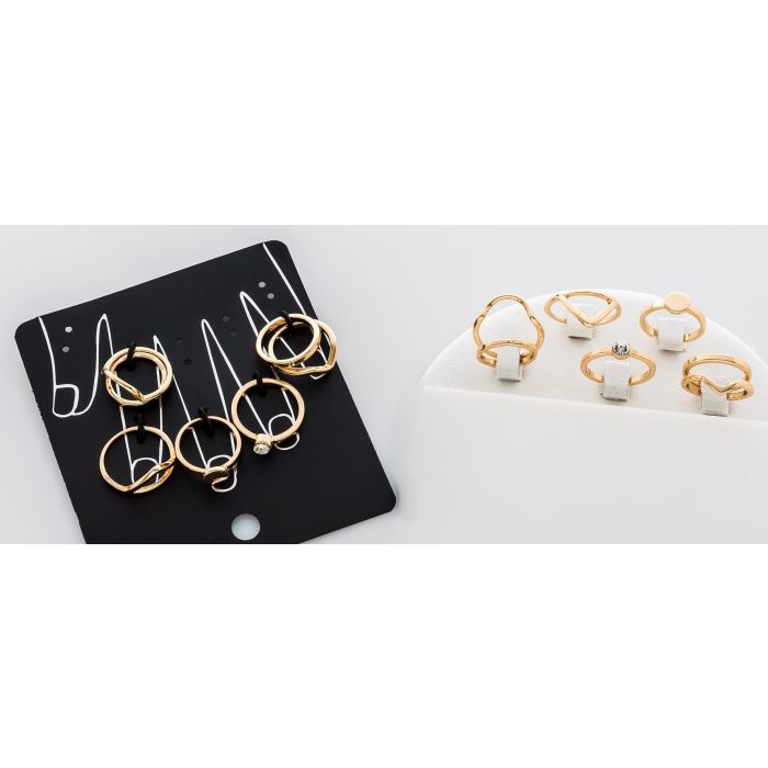 Παίξε με τις υφές και τα σχέδια: το κλασικό βεράκι, η ρομαντική πέρλα, η διακριτική λάμψη του στρας, το μοντέρνο ανοιχτό σχέδιο. Αυτό το σετ σου δίνει την απόλυτη ελευθερία να γίνεις η στυλίστρια του εαυτού σου. Φόρεσέ τα όλα μαζί για ένα πλούσιο αποτέλεσμα ή διάλεξε δύο-τρία για τις καθημερινές σου εμφανίσεις. Η κομψότητα δεν ήταν ποτέ τόσο εύκολη υπόθεση.