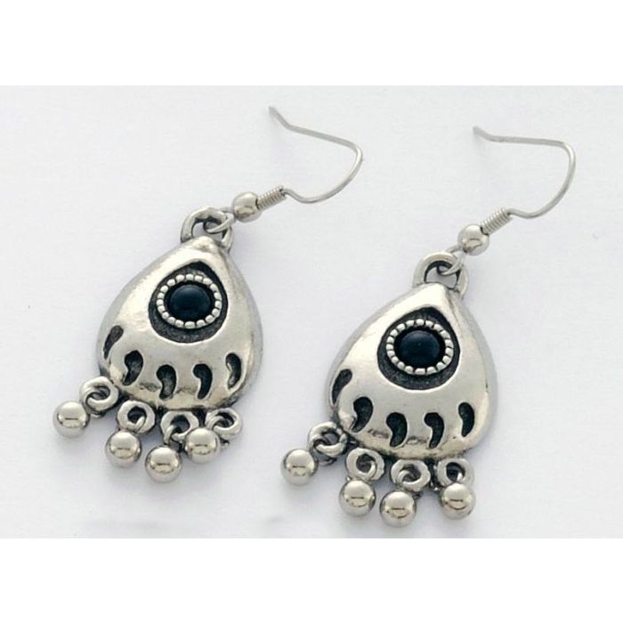Σκουλαρίκια μεταλλικά ασημί με χαραγμένο σχέδιο και μαύρη πέρλα