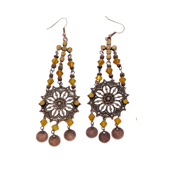 Υπάρχουν αξεσουάρ που απλώς συμπληρώνουν ένα look, και υπάρχουν κι εκείνα που το ορίζουν. Αυτά τα σκουλαρίκια ανήκουν στη δεύτερη κατηγορία. Φτιαγμένα για τη γυναίκα που αγαπά την ελευθερία, τα χρώματα της γης και την ανεπιτήδευτη κομψότητα, μοιάζουν σαν να έχουν φτιαχτεί κάτω από τον μεσογειακό ήλιο. Η περίτεχνη χάλκινη ροζέτα δημιουργεί ένα παιχνίδι με το φως, ενώ οι μικροσκοπικές πορτοκαλί χάντρες στο εσωτερικό της προσθέτουν ένα απροσδόκητο, ζωηρό pop χρώματος που φωτίζει το πρόσωπο.