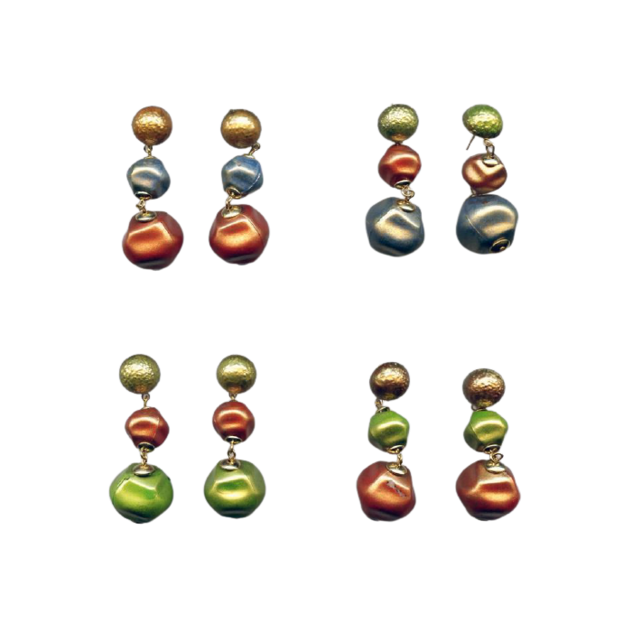 Δώστε έμπνευση στο στιλ σας με αυτά τα κομψά κρεμαστά σκουλαρίκια, που συνδυάζουν την ανθεκτικότητα του μετάλλου με την παιχνιδιάρικη αισθητική των πολύχρωμων χαντρών σε τέσσερις προσεγμένους συνδυασμούς. Ιδανικά για όσες αγαπούν τα χρώματα χωρίς να χάνουν τη φινέτσα.