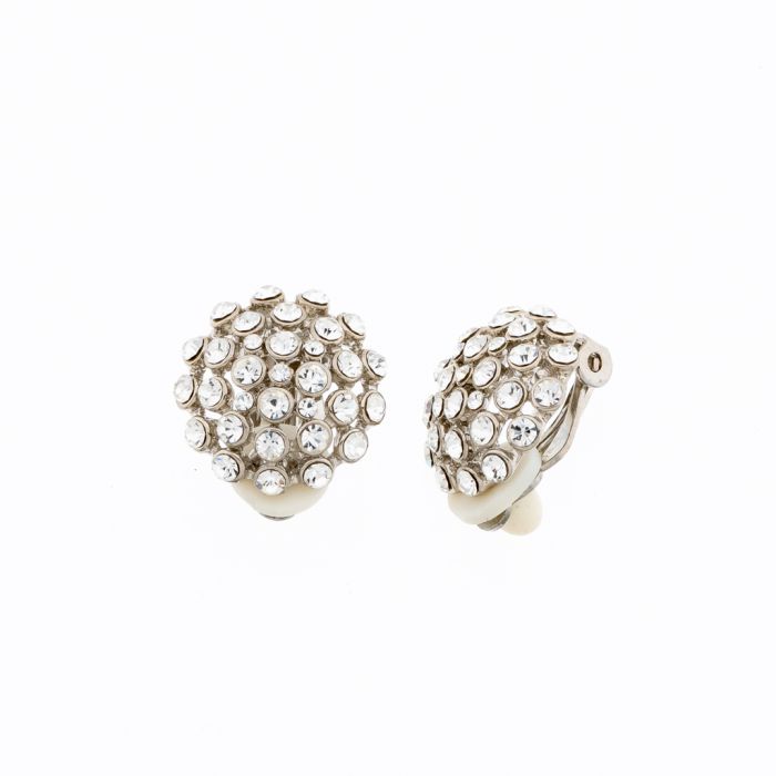 Description / Σκουλαρίκια μεταλλικά πομπέ ασημί διακοσμημένα με λευκά στράς