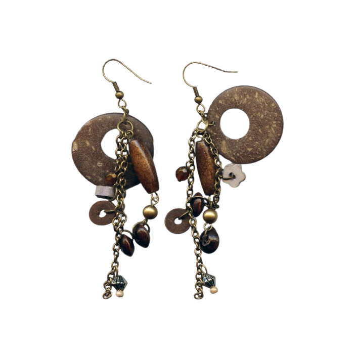 Μεταλλικά Σκουλαρίκια με Μπρούτζινη Αλυσίδα και Ξύλινες Λεπτομέρειες