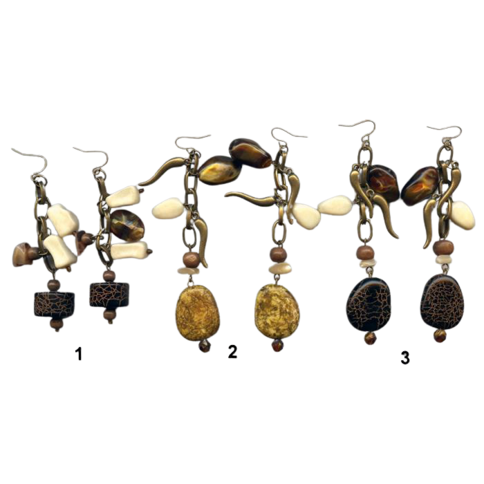 Σκουλαρίκια μπρούτζινα διακοσμημένα με πέτρες,ξύλο και μεταλλικές λεπτομέρειες