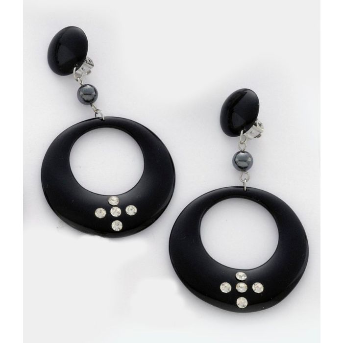 Σκουλαρίκια πλαστικά κρεμαστά με κλίπ σε μαύρο χρώμα διακοσμημένα με μαύρη χάντρα και λευκά στράς