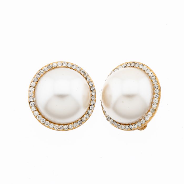 Description / Σκουλαρίκια στρογγυλά μεταλλικά διακοσμημένα με στράς και πέρλα σε 2 χρώματα